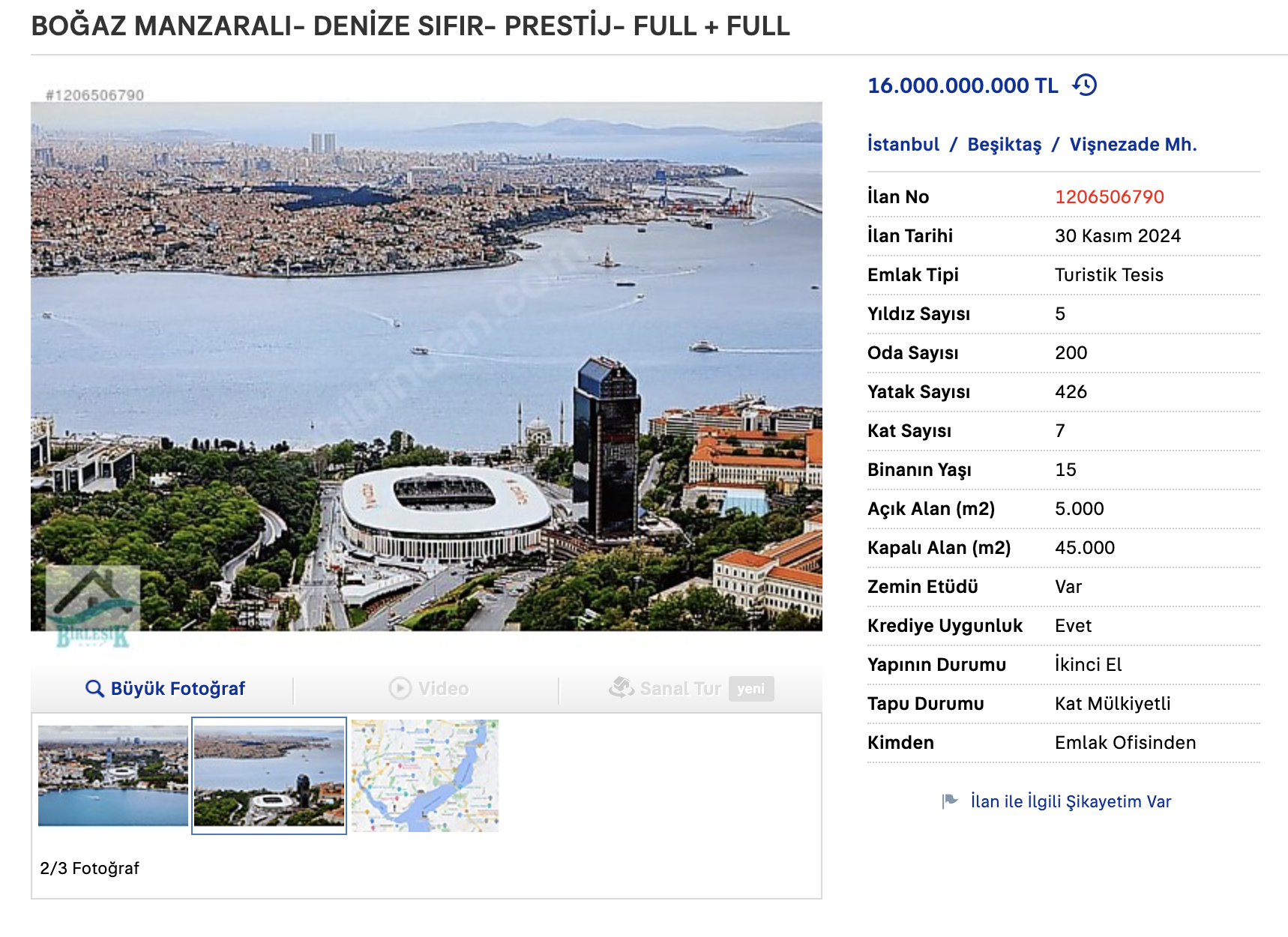 Satılık ilanlar arasında yer alan İstanbul’un Beşiktaş ilçesindeki Boğaz manzaralı, denize sıfır 200 oda, 426 yatak kapasiteli 5 yıldızlı otel 16 milyar TL’lik fiyatıyla en pahalı otel olarak dikkat çekiyor.