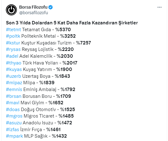 Borsada bayram sonrası için pozitif bir süreç beklenirken, yatırımcılar da en çok kazandıran hisseleri araştırıyor. Borsa Filozofu https://x.com/borsafilozofu X sosyal medya hesabından yaptığı paylaşımda, son 3 yılda dolardan 5 kat daha fazla kazandıran şirketleri açıkladı.