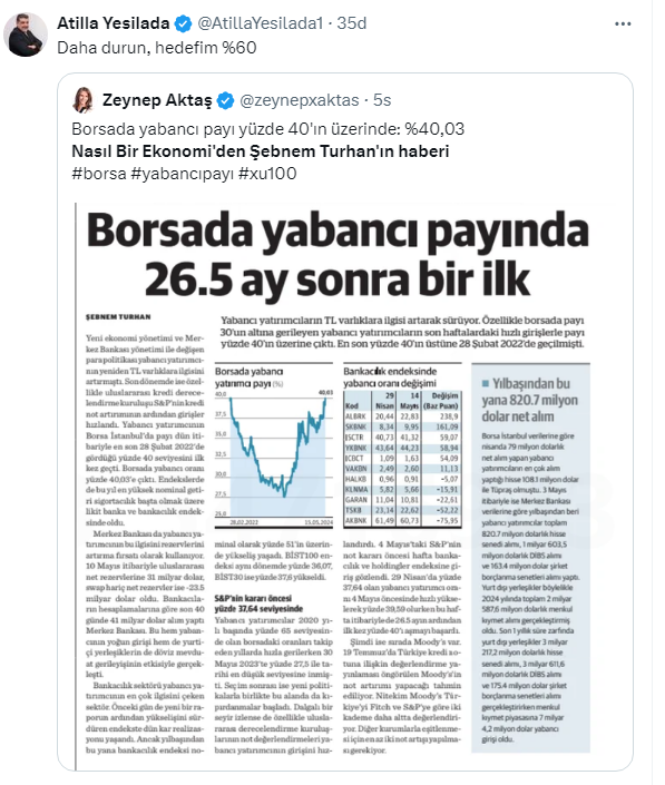 Konuyla ilgili ünlü ekonomist Atilla Yeşilada sosyal medya hesabı X'ten yabancı yatırımcıların payının artmaya devam edeceğini belirterek, hedefinin yüzde 60 olduğunu açıkladı. İşte o açıklama ve takipçilerden gelen yorumlar...