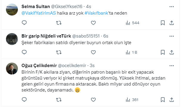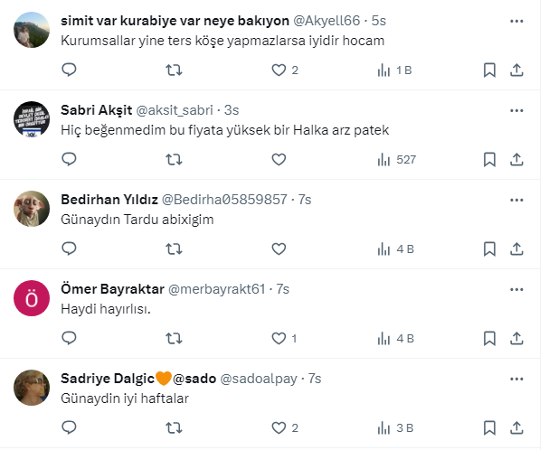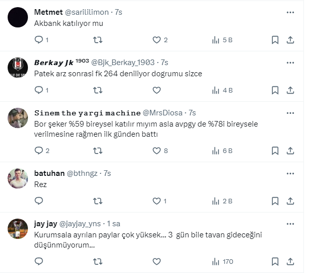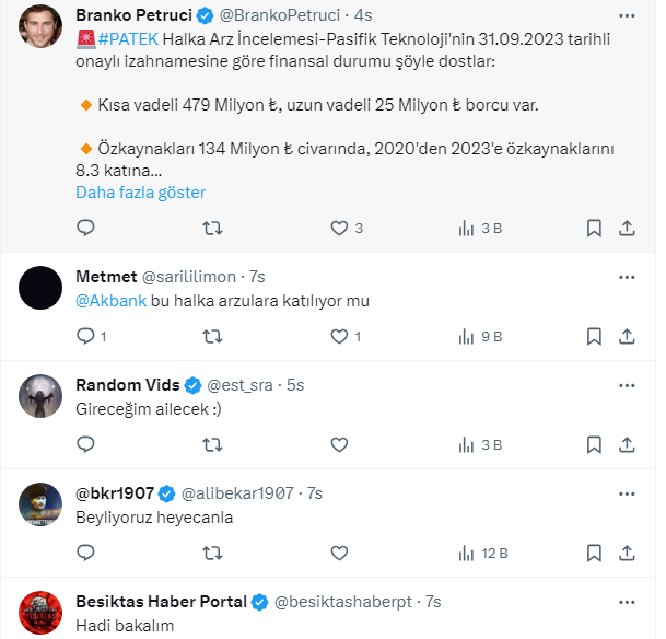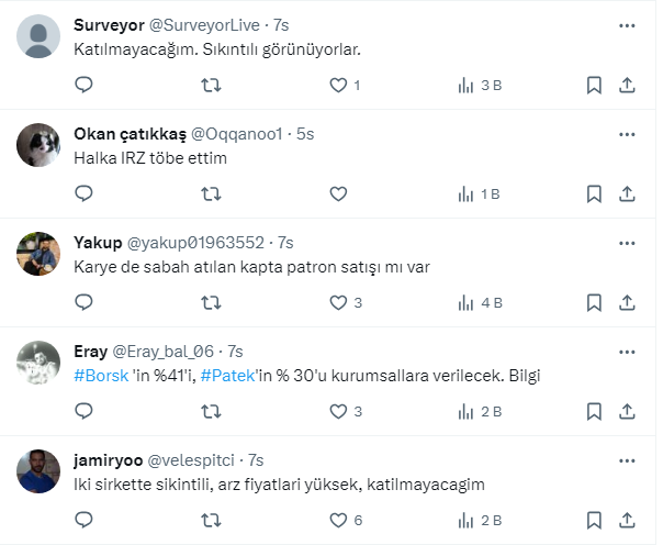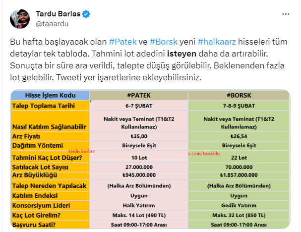 Borsa Temel Analisti Tardu Barlas, bu hafta halka arz olacak #Patek ve Bork hisseleriyle ilgili tüm detayları twitter.com/taaardu X sosyal medya hesabından paylaştı. Talepte bir düşüş görülebileceğini belirten Tardu Barlas’ın takipçileri de paylaşıma yaptığı yorumlarda fiyatların yüksek olduğunu söyledi.