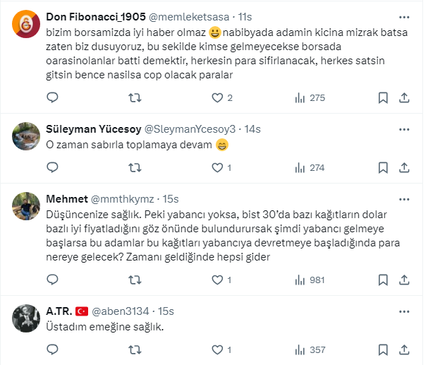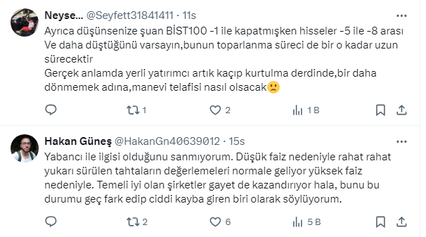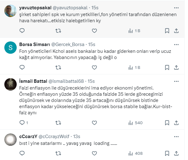 Çok haklılar ama bunun sebebi, borsada yabancının olmayışı. Ben 1995 den beri piyasadayım, şu anda yabancı takası yüzdesel olarak tarihin en düşük seviyelerinde ve bu uzun süredir de böyle. Daha önce düşük faiz ortamında olduğumuz için, yerli büyük para ve KY’ler piyasanın içindeydi ama şu anda faiz yüksek, para kıymetli ve büyük paranın önemli bir kısmı faizde. KY den kaçabilen kaçtı, kaçamayanlar da yüksek maliyetle bekliyor. Dolayısıyla tahtalar boş, alıcılar isteksiz ve piyasa aşağı yönlü çalışıyor.