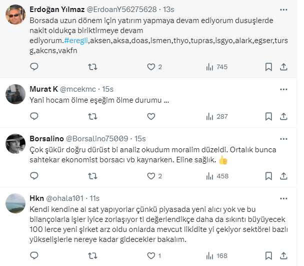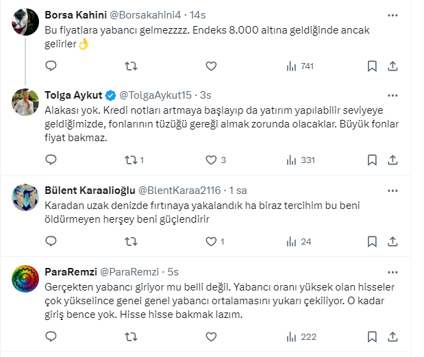 Peki bu ne zaman düzelir? Piyasa bitti mi? Tabii ki hayır ama önce gri listeden çıkmamız lazım. O zaman bir kısım yabancı alışı daha gelecek. Piyasa yine biraz kıpırdanır. Sonra notlar artacak, biraz daha yabancı alışı gelir, sonra endeks yavaş yavaş hızlanmaya başlar. Faizler düşmeye başladığında ise KY gelmeye başlar ve piyasaya ekstra bir ivme katar.