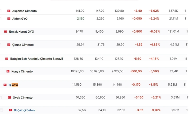 İşte Borsa İstanbul’da düşen GYO ve çimento hisseleri