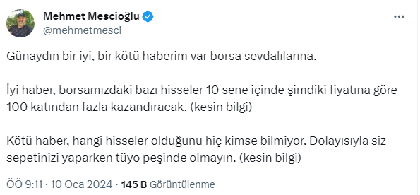 borsa yatırımcıların gündemindeki yerini korurken Mescomedia Genel Müdürü ve borsacı Mehmet Mescioğlu, resmi sosyal medya hesabın https://twitter.com/mehmetmesci'den yaptığı paylaşımda borsa sevdalılarına bir iyi bir de kötü haber verdi.