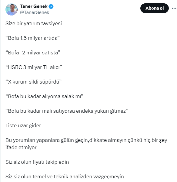 Borsa yatırımcıları ise hangi hisselerin daha çok kazandırğını araştırmaya devam ediyor. Borsa uzmanı Taner Genek sosyal medya hesabından yatırımcılara yatırım tavisyesinde bulunarak ''Siz siz olun temel ve teknik analizden vazgeçmeyin'' uyarısı yaptı. İşte Genek'in o paylaşımı ve gelen yorumlar...