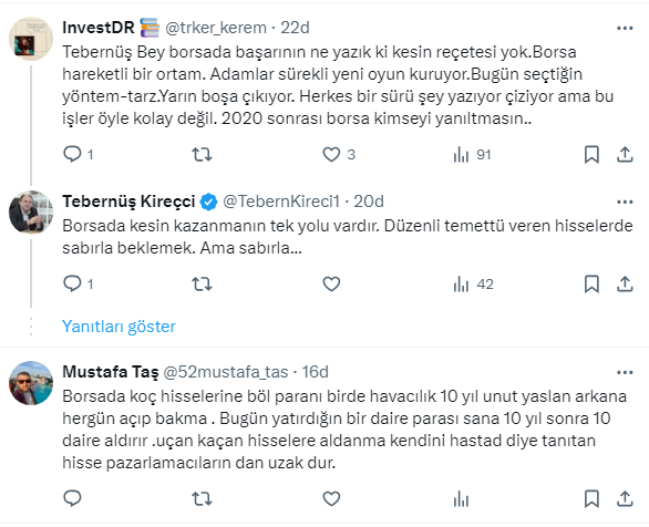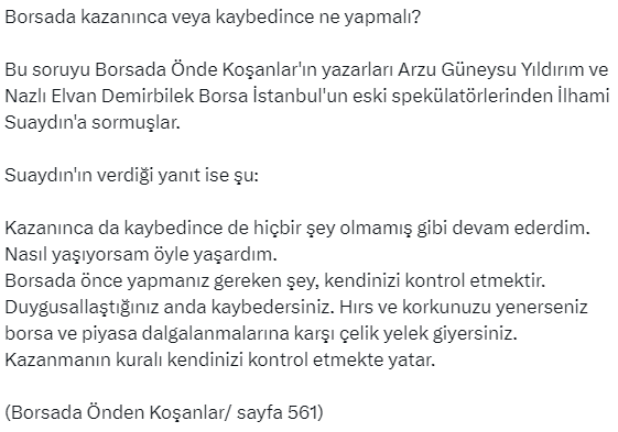 Borsa İstanbul'da BIST 100 endeksi, dün yüzde 5,37 değer kazanarak günü 9.618,83 puanla rekor seviyeden tamamladı. Borsa yükselmeye devam ederken yatırımcılar heyecanla borsayı yakından takip ediyor. Kazananların olduğu kadar kaybedenlerin de yer aldığı borsa yatırımında Türkiye'nin 1 numaralı emlak ve konut editörü Tebernüş Kireçci sosyal meyda hesabı X'ten Borsada Önde Koşanlar kitabının 561. sayfasındaki tavsiyeyi yatırımcılar için paylaştı. İşte o paylaşım ve gelen yorumlar...