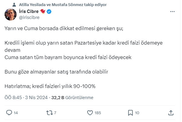 Yarın ve Cuma borsada dikkat edilmesi gereken şu; Kredili işlemi olup yarın satan Pazartesiye kadar kredi faizi ödemeye devam Cuma satan tüm bayram boyunca kredi faizi ödeyecek