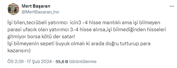 İşi bilen,tecrübeli yatırımcı icin3 -4 hisse mantıklı ama işi bilmeyen parasi ufacık olan yatırımcı 3-4 hisse alırsa,işi bilmediğinden hisseleri gitmiyor borsa kötü der satar!