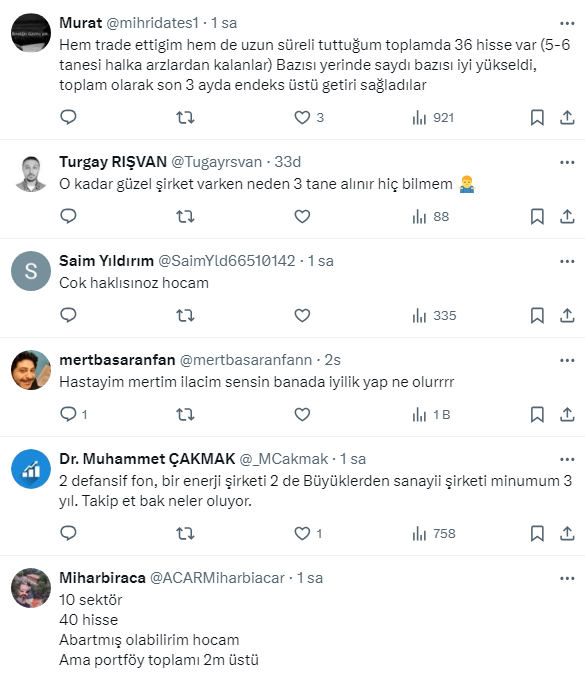 Murat @mihridates1: Hem trade ettigim hem de uzun süreli tuttuğum toplamda 36 hisse var (5-6 tanesi halka arzlardan kalanlar) Bazısı yerinde saydı bazısı iyi yükseldi, toplam olarak son 3 ayda endeks üstü getiri sağladılar