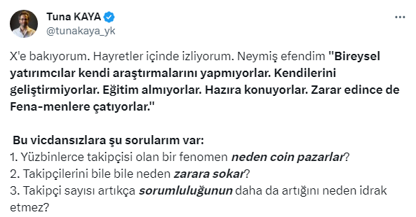Stratejist ve yatırım uzmanı Tuna Kaya https://twitter.com/tunakaya_yk X sosyal medya hesabından yaptığı paylaşımda bireysel yatırımcının bu durumdan dolayı, “Kendilerini geliştirmiyorlar, eğitim almıyorlar, hazıra konuyorlar” diyen fenomenleri hayretle izlediğini belirtti. Kaya bireysel yatırımcıyı suçlayan fena-menlere 8 soru sordu…