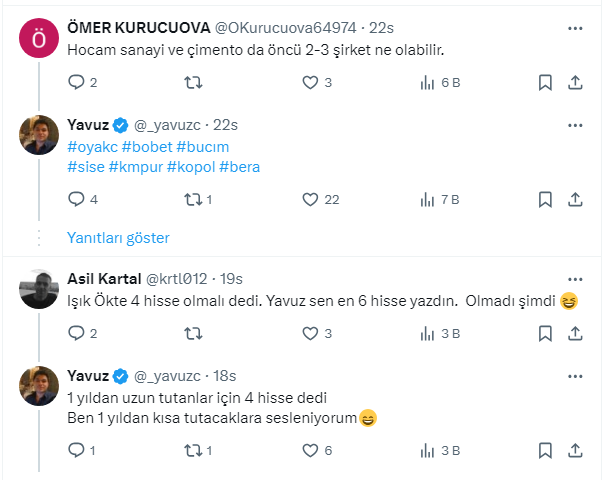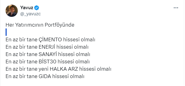 Bir yatırımcının portföyünde neler olmalı sorusunu Analist Yavuzc https://twitter.com/_yavuzc X sosyal medya hesabından yaptığı paylaşımla verdi. Yatırımcıların portföyünde olması gereken sektörleri saydı. Yavuzc, çimento, enerji, sanayi, gıda, sektörlerinden birer hisse ile bist30 ve halka arz şirketlerinden en az bir tane hisse alınmasını tavsiye etti.