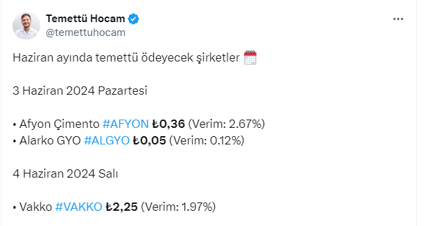 Borsa yatırımcısının tercih ettiği temettü hisselerinde de kar payı dağıtımı devam ediyor. 317 bin takipçili Temettü Hocam, https://x.com/temettuhocam X sosyal medya hesabından yaptığı paylaşımda, haziran ayında temettü ödeyecek şirketleri sıraladı. İşte o şirketler…