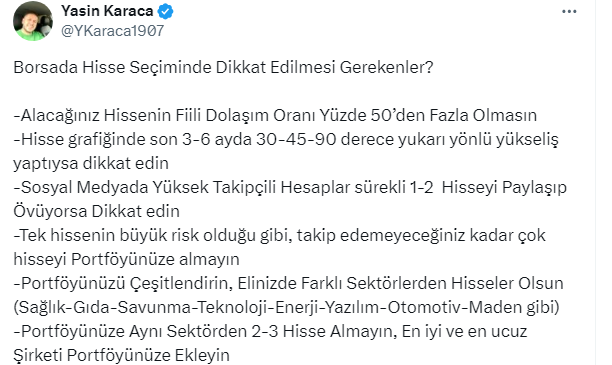 Yatırımcılar ise hisse seçiminde artık daha temkinli davranıyor. Peki Borsa İstanbul’da hisse seçerken nelere dikkat edilmeli? Analist ve stratejist Yasin Karaca, https://x.com/YKaraca1907 X sosyal medya hesabından yapığı paylaşımda 32 maddede yatırımcıya rehber niteliğinde bilgiler paylaştı. Karaca paylaşımında yatırımcının hisse seçerken incelemesi gerekenleri tek tek anlattı..