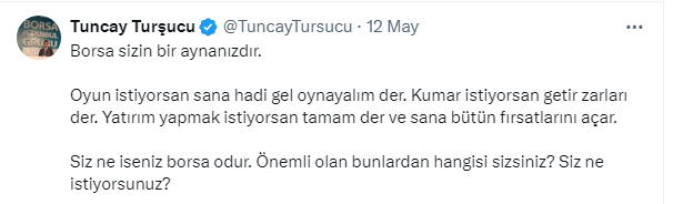 “Borsa sizin aynanızdır” diyen SPK lisanslı borsa analisti, Matematik Mühendisi ve Araştırmacı Tuncay Turşucu https://twitter.com/TuncayTursucu X sosyal medya hesabından yaptığı paylaşımda, borsada işlem yapanlara “Siz hangisisiniz” diye sordu.