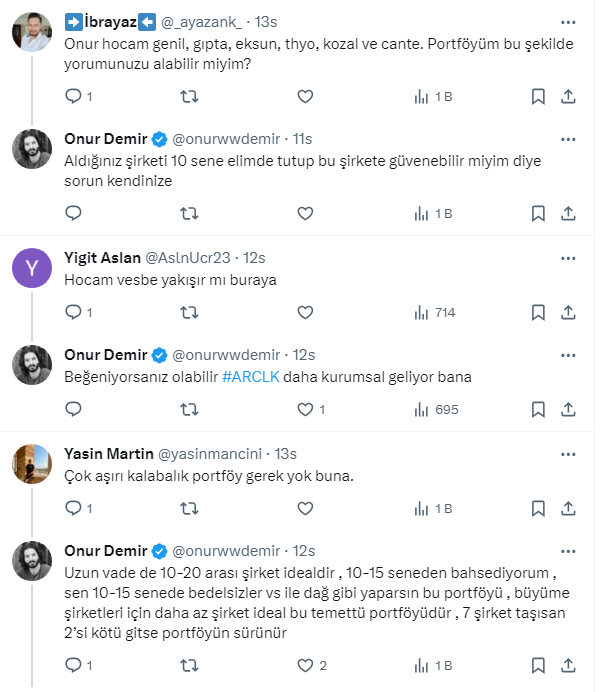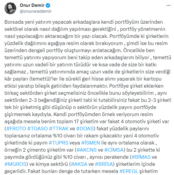 Uzun vade hisse senedi yatırımcısı Onur Demir resmi sosyal medya hesabı üzerinden yaptığı paylaşımda borsada yeni yatırım yapacaklara kendi portföyü üzerinden sektörel olarak nasıl dağılım yapılması gerektiğini portföy yönetmenin nasıl yapılacağını anlattı. İşte Onur Demir'in o paylaşımı...