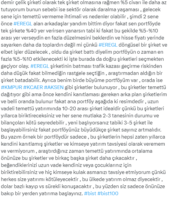 Fakat bunları denge de tutarken mesela #EREGL şirketim demir çelik şirketi olarak tek şirket olmasına rağmen yüzde 5 civarı ile daha az tutuyorum bunun sebebi ise sektör olarak daralma yaşaması , gelecek sene için temettü vermeme ihtimali vs nedenler olabilir, şimdi 2 sene önce #EREGL alan arkadaşlar yandım bittim diyor fakat sen portföyde tek şirkete yüzde 40 yer verirsen yanarsın tabi ki fakat bu şekilde yüzde 5-yüzde 10 arası yer verseydin en fazla düzelmesini beklerdin ve hisse fiyatı yerinde sayarken daha da toplardın değil mi çünkü #EREGL döngüsel bir şirket ve elbet işler düzelecek , oldu da şirket battı diyelim portföyün o zaman en fazla yüzde 5- yüzde 10 etkilenecekti ki işte burada da doğru şirketleri seçmekten geçiyor olay. #EREGL şirketinin batması trafik kazası geçirme riskinden daha düşük fakat bilmediğin rastgele seçtiğin, araştırmadan aldığın bir şirket batadabilir.