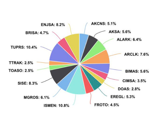 Resim aşağıda. Mesela benim toplam 17 şirketim var fakat 4 otomotiv şirketi var (#FROTO #TOASO #TTRAK ve #DOAS) fakat yüzdelik paylarını toplarsanız ortalama yüzde10 civarı bir rakam çıkacaktır yani 4 otomotiv şirketinde ki payım #TUPRS veya #İSMEN ile aynı ortalama olarak , örneğin 2 çimento şirketim var (#AKCNS ve #CİMSA) bu 2 şirkette ki payımda gördüğünüz gibi yüzde10 civarı , aynısı perakende (#BİMAS ve #MGROS) ve kimya sektörü (#AKSA ve #BRİSA) şirketlerim içinde geçerlidir.
