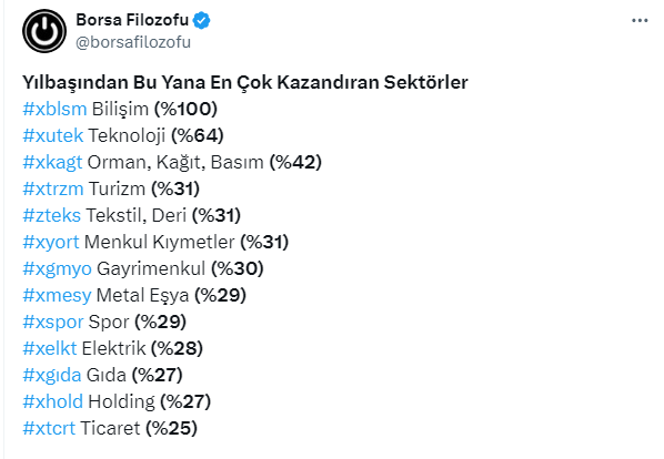 Peki borsada yılbaşından bu yana hangi sektör ne kadar kazandırdı? 231,2 bin takipçili Borsa Filozofu resmi https://twitter.com/borsafilozofu X sosyal medya hesabından yılbaşından bu yana en çok kazandıran sektörleri paylaştı. En çok bilişim en az ise ticaret sektörü kazandırdı.