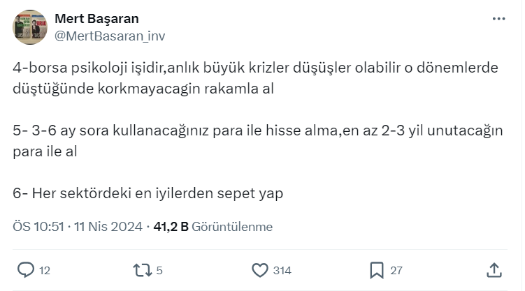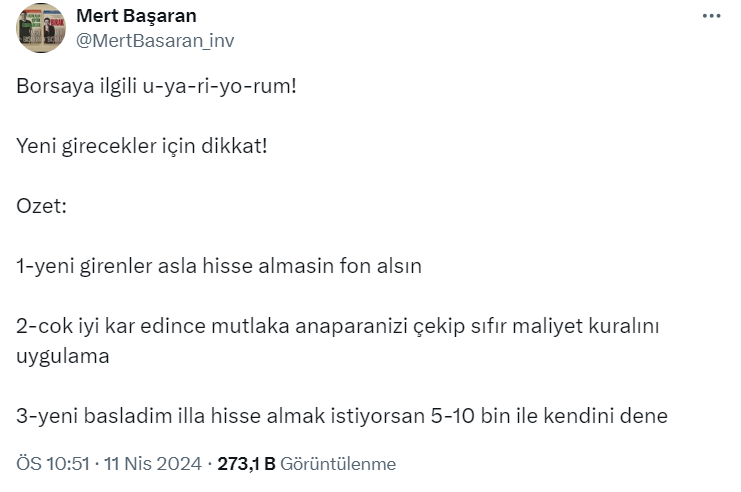 Mert Başaran yaptığı paylaşımda "Borsayla ilgili uyarıyorum" diyerek, yeni gireceklerin dikkat etmesi gerekenleri tek tek sıraladı.