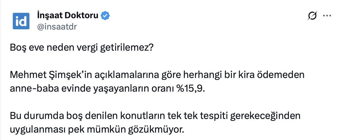 60,8 bin takipçili İnşaat Doktoru resmi sosyal medya hesabı üzerinden yaptığı paylaşımda boş eve neden vergi getirilemeyeceğini açıkladı.