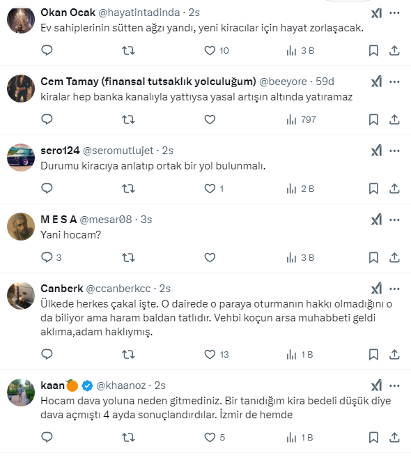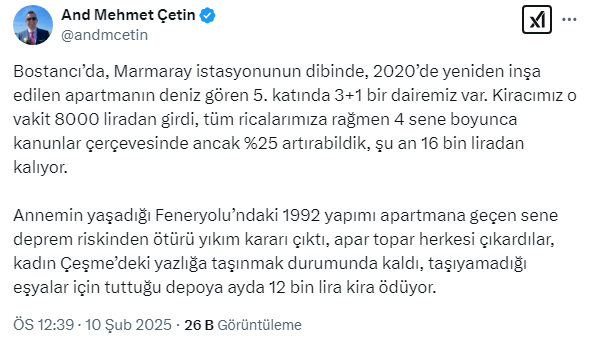 Annesinin yaşadığı eve yıkım kararı çıktığını ve evin eşyalarını koyabilmek için bir depoya aylık 12 bin lira kira verdiklerini açıklayan Çetin, kiracısının evini adeta rehin aldığını ve bir depo ücreti kadar kira ödediğini açıkladı. İşte ev sahibi Mehmet Çetin'in sosyal medya hesabı X'ten yaptığı o paylaşım ve gelen yorumlar...
