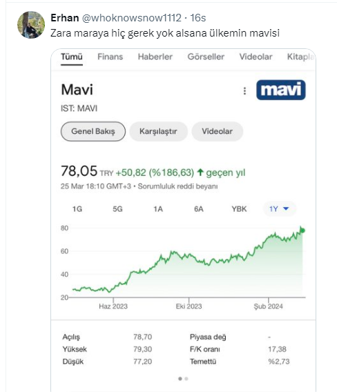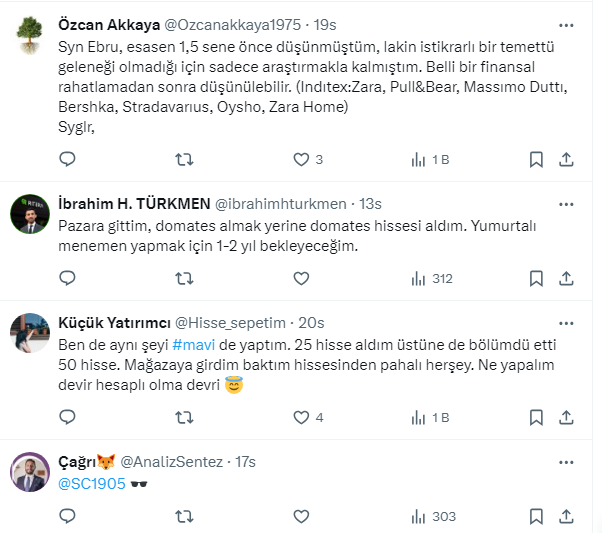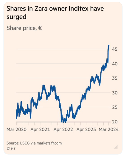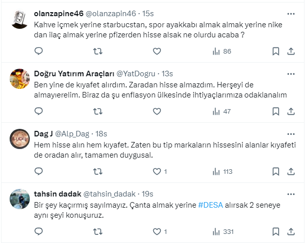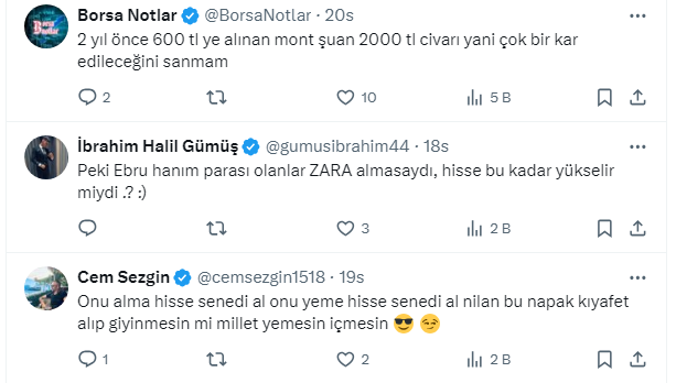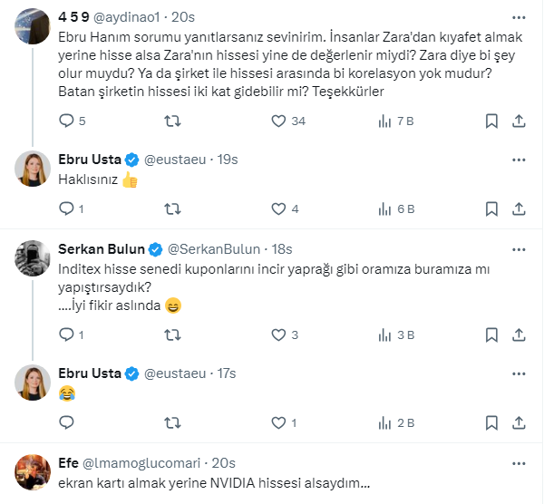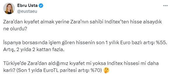 Zara’dan kıyafet almak yerine Zara’nın sahibi Inditex’ten hisse alsaydık ne olurdu? İspanya borsasında işlem gören hissenin son 1 yıllık Euro bazlı artışı yüzde 55. Artış, 2 yılda 2 kattan fazla. Türkiye’de Zara’dan aldığımız kıyafet mi yoksa Inditex hissesi mi daha karlı? (Son 1 yılda EuroTL paritesi artışı yüzde 70) Bakın vatandaş bu soruya ne cevap verdi.