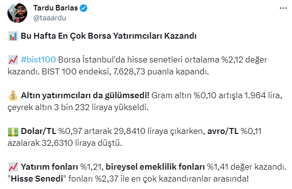 Borsa Temel Analisti Tardu Barlas resmi sosyal medya hesabı https://twitter.com/taaardu üzerinden yaptığı paylaşımda bu hafta en çok borsa yatırımcılarının kazandığını kaydetti.