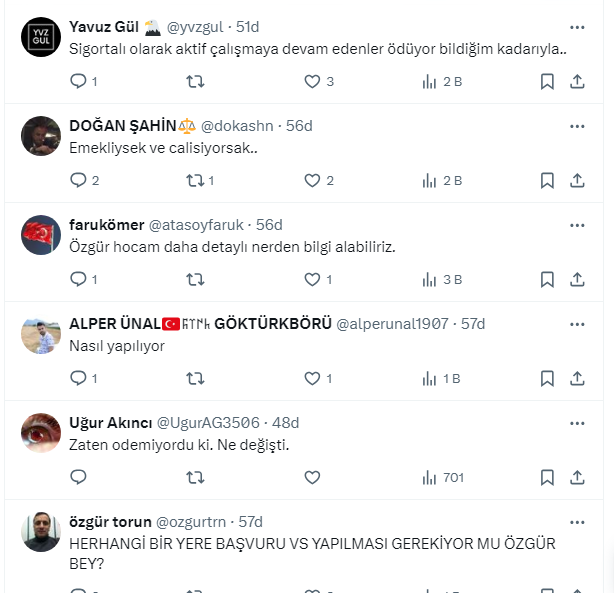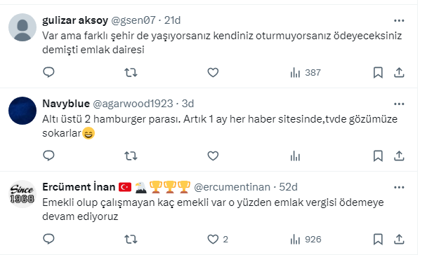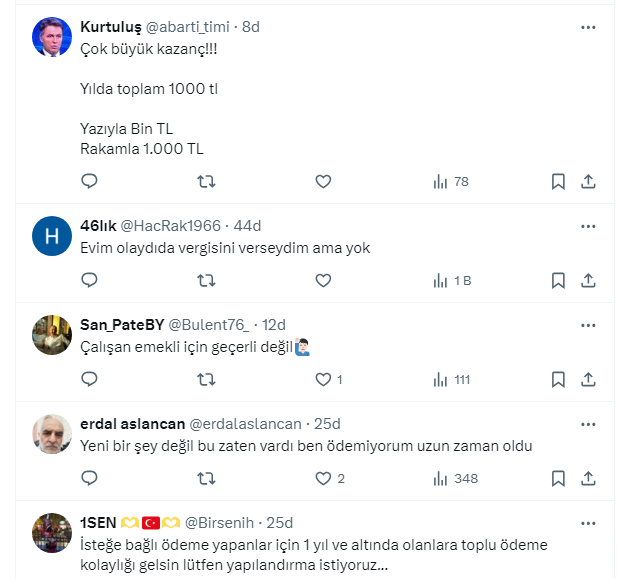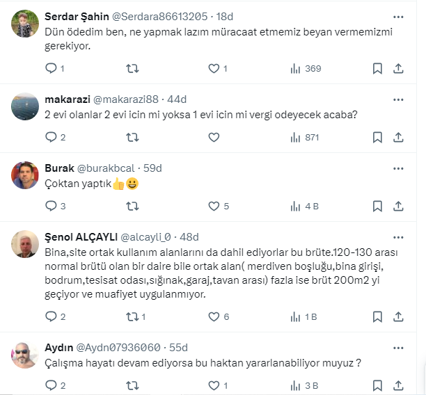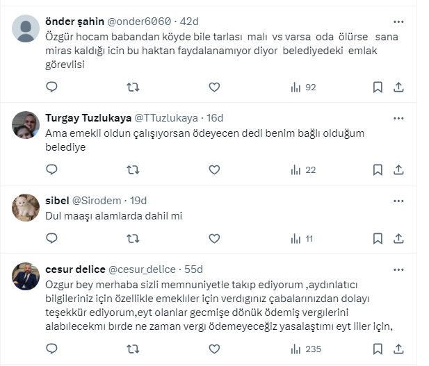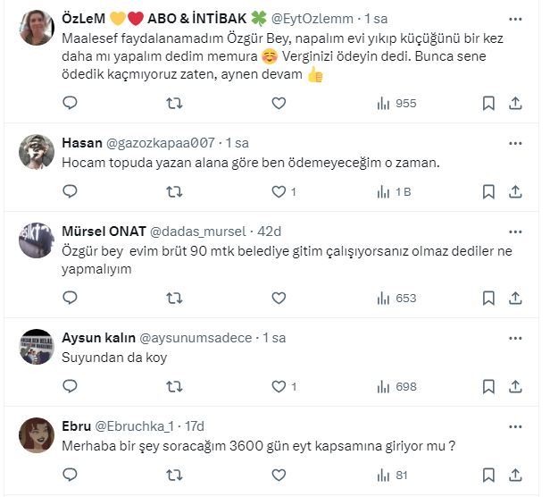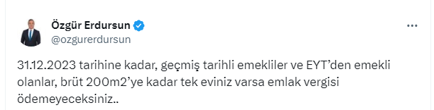 Erdursun https://twitter.com/ozgurerdursun resmi X sosyal medya hesabından yaptığı paylaşımda, 31 Aralık 2023’e kadar, geçmiş tarihli emekliler ve EYT’den emekli olanlar, brüt 200 metrekareye kadar tek ev olanların emlak verdiği ödemeyeceğini bildirdi.