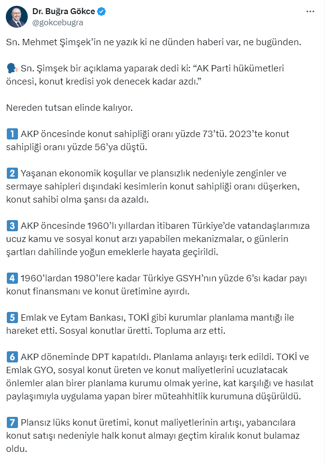 Mehmet Şimşek'e cevap İBB eski Genel Sekreter Yardımcısı Buğra Gökce'den geldi. Gökçe resmi X hesabı http://twitter.com/gokcebugra üzerinden yaptığı paylaşımda, "AK Parti öncesinde konut sahipliği oranı yüzde 73’tü. 2023’te konut sahipliği oranı yüzde 56’ya düştü." ifadelerini kullandı.