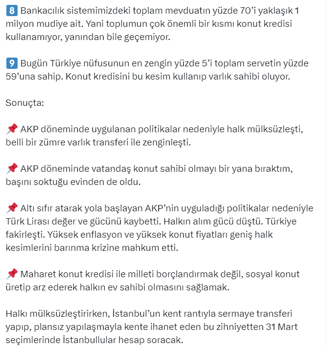 - AKP döneminde uygulanan politikalar nedeniyle halk mülksüzleşti, belli bir zümre varlık transferi ile zenginleşti.
