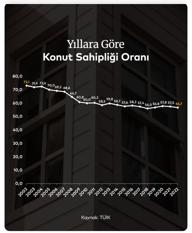 1. AKP öncesinde konut sahipliği oranı yüzde 73’tü. 2023’te konut sahipliği oranı yüzde 56’ya düştü.