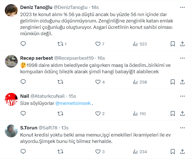 Hazine ve Maliye Bakanı Mehmet Şimşek geçtiğimiz günlerde yaptığı bir açıklamada AK Parti hükümetleri öncesi, konut kredisi yok denecek kadar az olduğunu belirterek, "Biz tek haneye indirince, krediye erişim arttı" ifadelerini kullanmıştı.