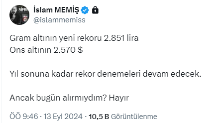 İslam Memiş, az önce sosyal medya hesabından altındaki rekor haberini duyurarak açıklama yaptı. Memiş, altın fiyatlarının yıl sonuna kadar yükselmeye devam edeceğini açıkladı. Milyonların merak ettiği ''bugün altın alalım mı?'' sorusuna ise net şekilde ''HAYIR'' dedi. İşte İslam Memiş'in sosyal medya hesabı X'ten yaptığı o paylaşım....