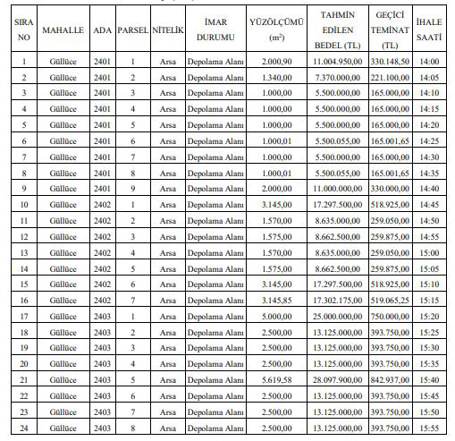 Bursa Mustafakemalpaşa Belediye Başkanlığı, tamamı Güllüce Mahallesi’nde yer alan toplam 24 adet arsayı satacağını duyurdu. 24 Kasım 2023 Cuma günü saat 14.00-15.55 arasında kapalı teklif usulüyle satılacak arsaların geçici teminat ve muhammen bedelleri belli oldu.