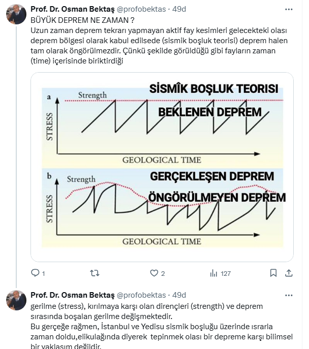 Büyük depremin tam olarak öngörülmediğini belirten Bektaş, ''uzun zaman deprem tekrarı yapmayan aktif fay kesimleri gelecekteki olası deprem bölgesi olarak kabul edilsede (sismik boşluk teorisi) deprem halen tam olarak öngörülmezdir'' ifadelerini kullandı. İşte Bektaş'ın sosyal medya hesabı X'ten yaptığı o paylaşım...