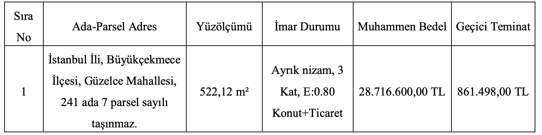 Satışa çıkarılan arsanın muhammen bedeli 28 milyon 716 bin 600 TL olarak açıklanırken, geçici teminat bedeli ise 861 bin 498 TL olarak açıklandı.