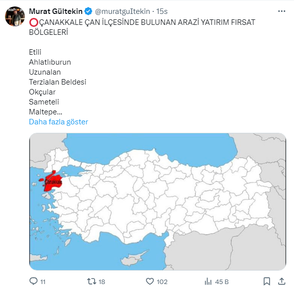 Murat Gültekin sosyal medya hesabı X'ten yaptığı paylaşımda, Çanakkale'deki arsa ve arazi yatırımında fırsat bölgeleri tek tek açıkladı. İşte o paylaşım...