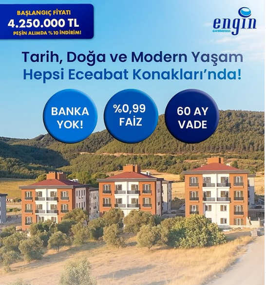 Ecebat Konakları 4 milyon 250 bin TL'den başlayan fiyatlarla satışa çıktı. Engin Gayrimenkul tarafından Ülkemizin cennet köşelerinden biri olan Çanakkale'de inşa edilen Ecebat Konakları, konut sahiplerine huzurlu bir yaşam alanı sunuyor.