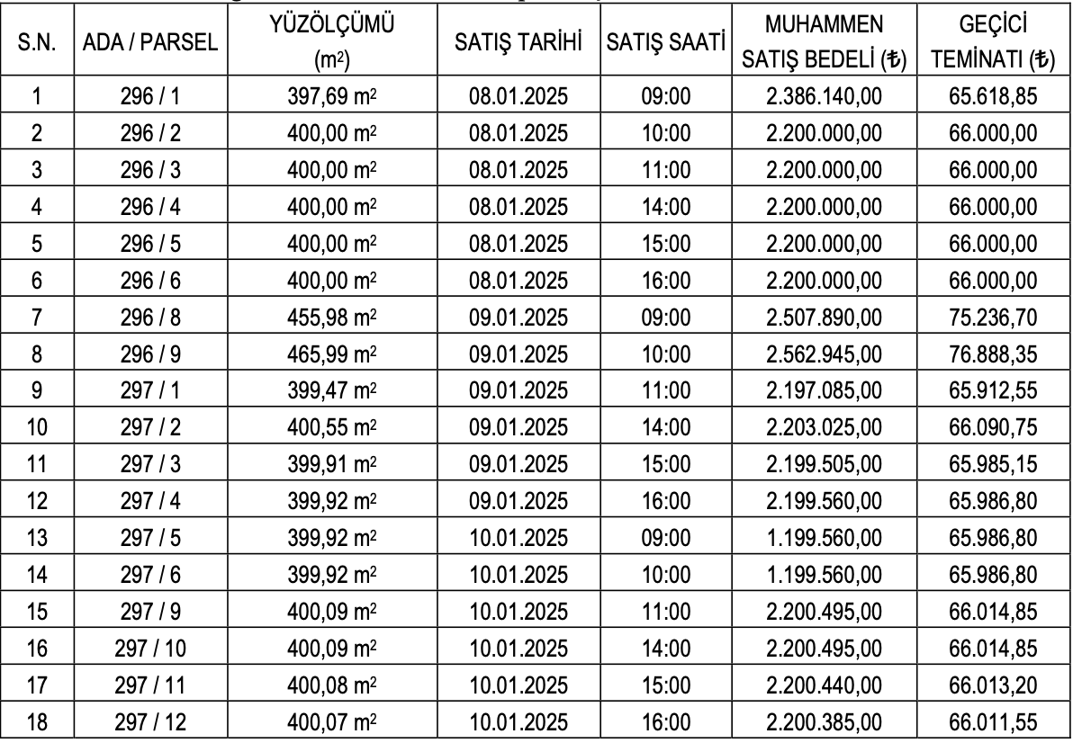 4) Satışı yapılacak 296 ada 1 parsel, 296 ada 2 parsel, 296 ada 3 parsel, 296 ada 4 parsel, 296 ada 5 parsel, 296 ada 6 parsel, 296 ada 8 parsel, 296 ada 9 parsel, 297 ada 1 parsel, 297 ada 2 parsel, 297 ada 3 parsel, 297 ada 4 parsel, 297 ada 5 parsel, 297 ada 6 parsel, 297 ada 9 parsel, 297 ada 10 parsel, 297 ada 11 parsel, 297 ada 12 parsellerin parsel numaraları ve yüzölçümleri belirtilen arsalar ayrı ayrı olmak üzere aşağıda yazılı listedeki muhammen satış bedelleri ile belirtilen tarih ve saatte yapılacaktır.