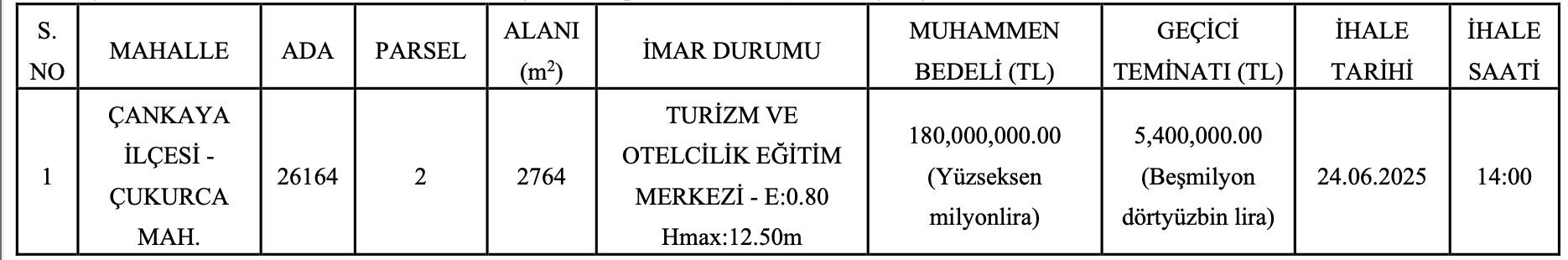 Çankaya Belediyesi’ne ait olan taşınmazın satış ihalesi 26 Haziran 2025 olarak açıklandı. Söz konusu ihale, 2886 sayılı Devlet İhale Kanunu’na göre açık teklif usulüyle yapılacak.