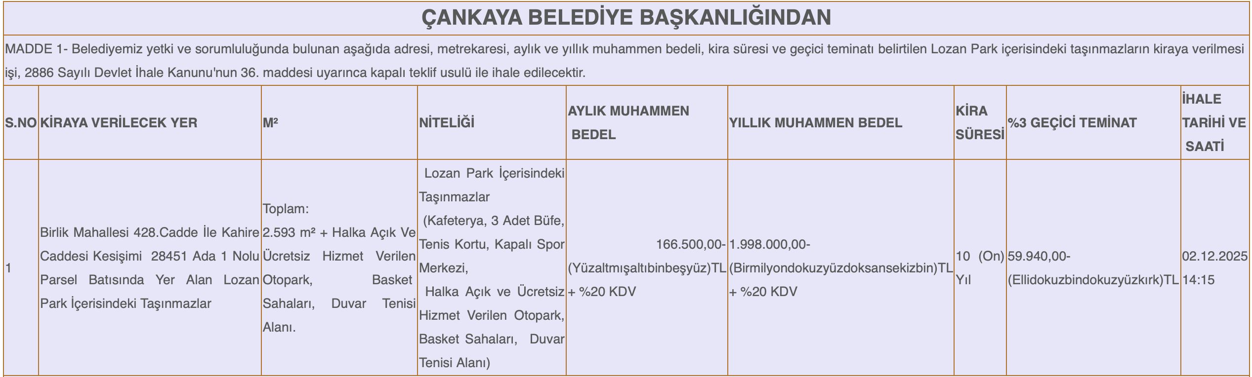Lozan Park içerisinde yer alan gayrimenkullerin kiralama ihalesi 2 Aralık 2025 tarihinde saat 14.15’te Çankaya Belediye Başkanlığı Encümen Salonu’nda yapılacak.