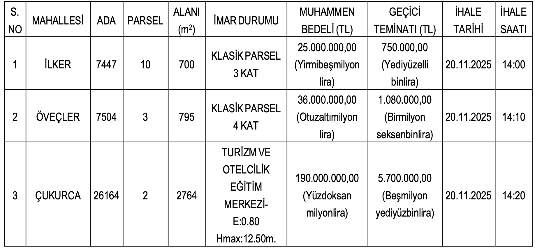 İlker, Öveçler ve Çukurca mahallerinde yer alan arazilerin satış ihalesi 20 Kasım 2025 tarihinde saat 14.00 ile 14.20 arasında Çankaya Belediyesi Encümen Salonunda yapılacak.