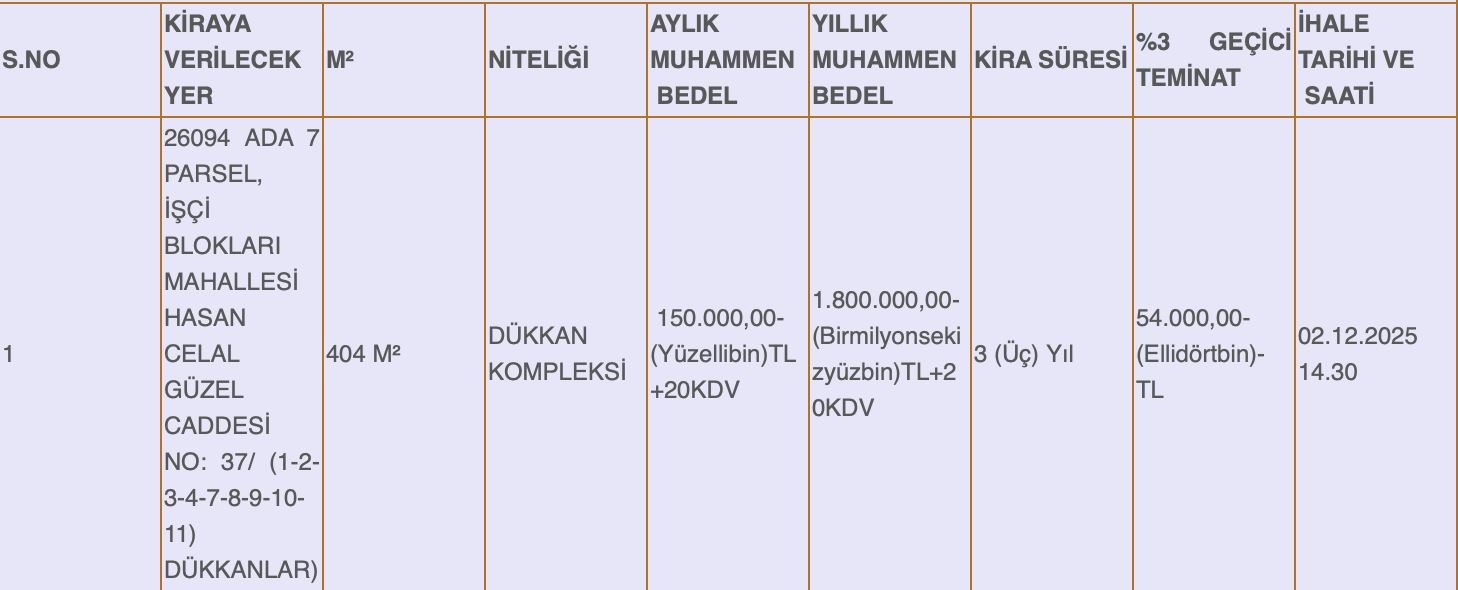 MADDE 1- Belediyemiz yetki ve sorumluluğunda bulunan aşağıda adresleri, metrekareleri, aylık ve yıllık muhammen bedelleri, kira süreleri ve geçici teminatları belirtilen yerlerin kiraya verilmesi işi, 2886 Sayılı Devlet İhale Kanunu'nun 36. maddesi uyarınca kapalı teklif usulü ile ihale edilecektir.