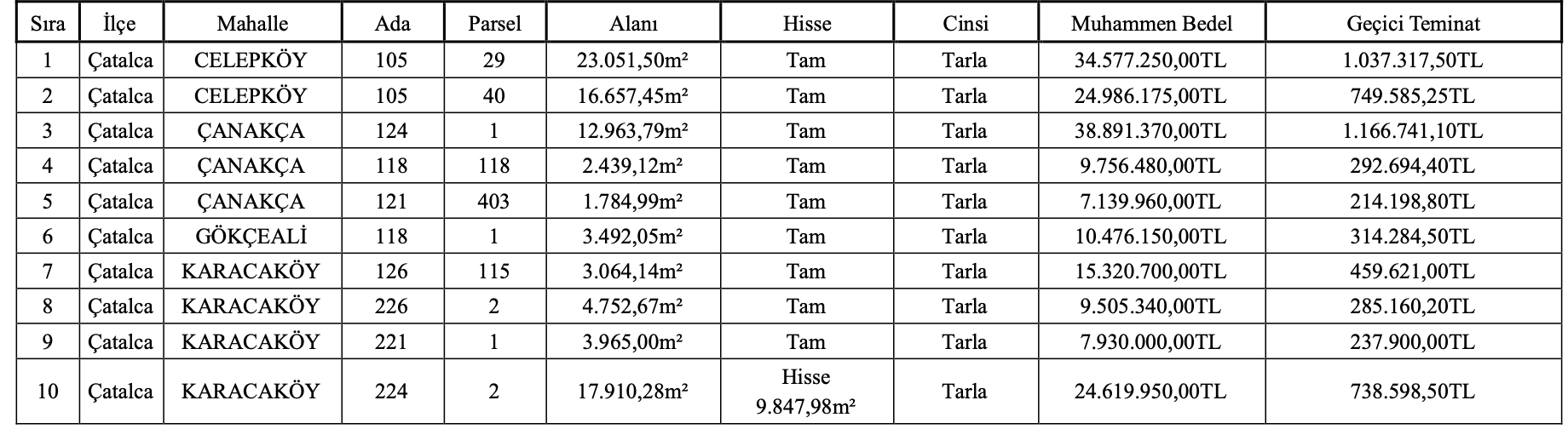 Söz konusu arazilerin muhammen bedelleri 7 milyon 139 bin 960 TL ile 38 milyon 891 bin 370 TL arasında farklılık gösterirken, geçici teminat bedelleri ise 214 bin 198,80 TL ile 1 milyon 166 bin 741,10 TL arasında farklılık gösteriyor.