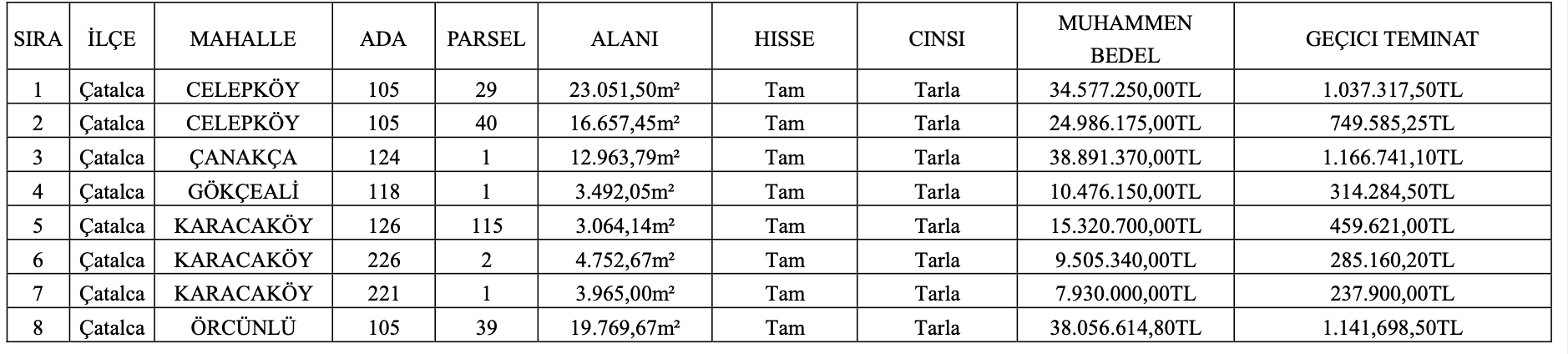 Çatalca Belediye Başkanlığı, İstanbul Çatalca’da yer alan 8 adet araziyi satışa çıkardı. Arazilerin satış ihalesi 30 Eylül tarihinde gerçekleştirilecek.
