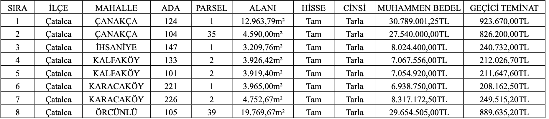 Söz konusu arazilerin muhammen bedelleri 6 milyon 938 bin 750 TL ile 30 milyon 789 bin 1,25 TL arasında farklılık gösterirken, geçici teminat bedelleri ise 208 bin 162,50 TL ile 923 bin 670 TL arasında farklılık gösteriyor.