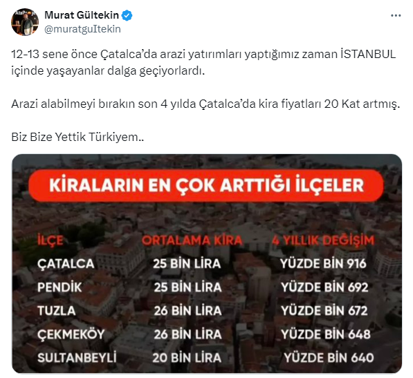 Gültekin; Çatalca'da ortalama kiraların 25 bin lira, 4 yıldaki değişimin yüzde bin 916, Pendik'te ortalama kiraların 25 bin lira 4 yıldaki değişimin yüzde bin 692, Tuzla'da ortalama kiraların 26 bin lira, 4 yıldaki değişimin yüzde bin 672, Çekmeköy'deki ortalama kiraların 26 bin lira, 4 yıldaki değişimin yüzde bin 648 ve Sultanbeyi'deki ortalama kiraların 20 bin lira, 4 yıldaki değişimin yüzde bin 640 olduğunu açıkladı.