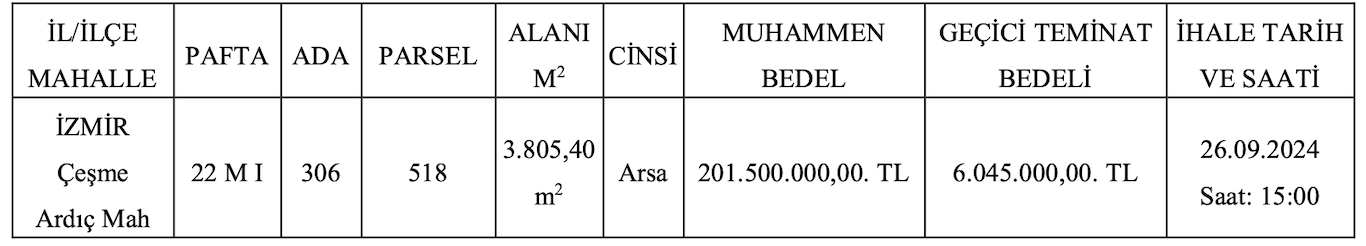 Çeşme Belediyesi mülkiyetinde bulunan arsa nitelikli taşınmaz satışa çıkarıldı. Bugünkü Resmi Gazete'de yer alan ilana göre, Ardıç Mahallesi’nde yer alan 3 bin 805 metrekare alana sahip arsanın satış ihalesi 26 eylül 2024 tarihinde saat 15.00’te yapılacak.