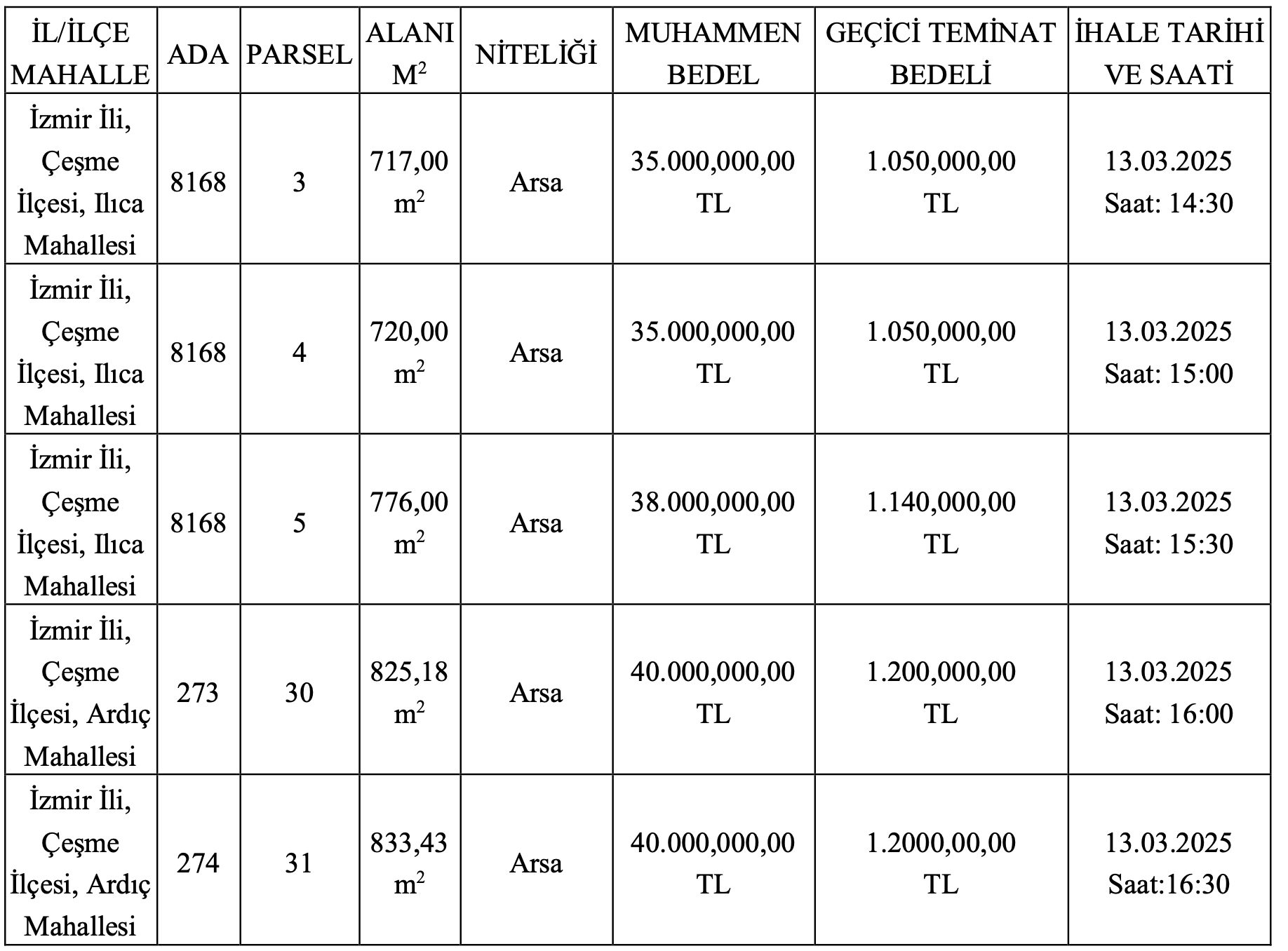 Çeşme Belediye Başkanlığı, İzmir Çeşme’de yer alan 5 adet arsayı satışa çıkardı. KDV’den muaf olarak satışa çıkarılan arsaların muhammen bedelleri 35 milyon TL’den başlıyor.