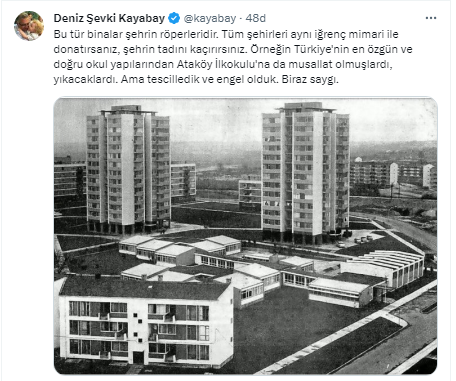 "Bu tür binalar şehrin röperleridir. Tüm şehirleri aynı iğrenç mimari ile donatırsanız, şehrin tadını kaçırırsınız. Örneğin Türkiye'nin en özgün ve doğru okul yapılarından Ataköy İlkokulu'na da musallat olmuşlardı, yıkacaklardı. Ama tescilledik ve engel olduk. Biraz saygı."